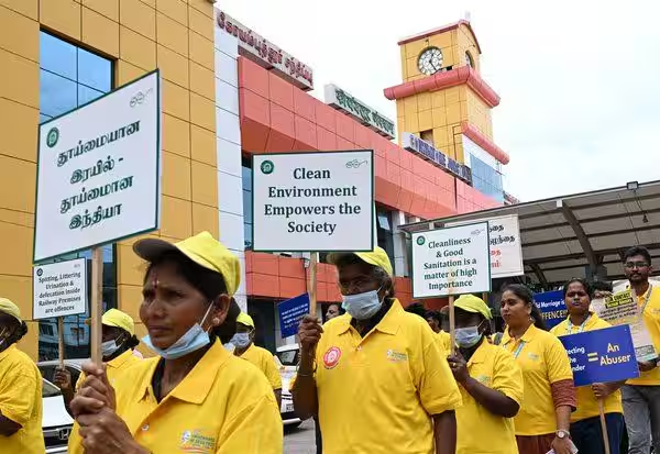 ரயில்வே பயணிகளிடம் துாய்மை விழிப்புணர்வு